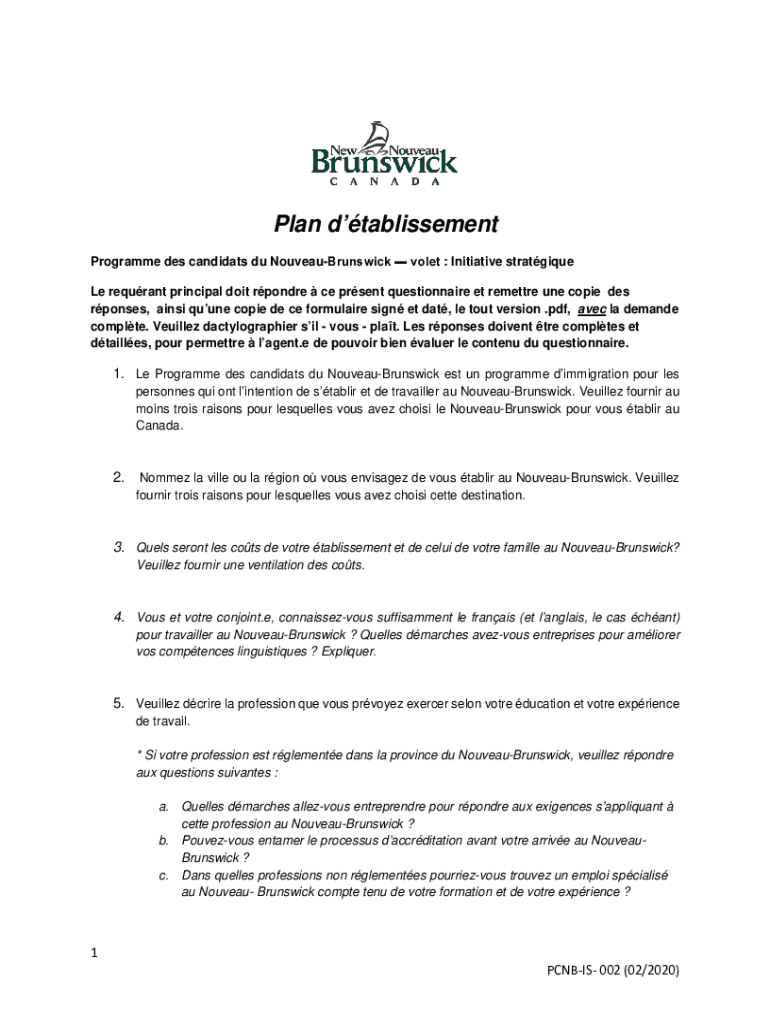 Plan dtablissement Program DES candidate Du NouveauBrunswick Violet : Initiative strategize Le return principal dot ponder CE present questionnaire ET resettle one copy DES responses, ANSI quine copy