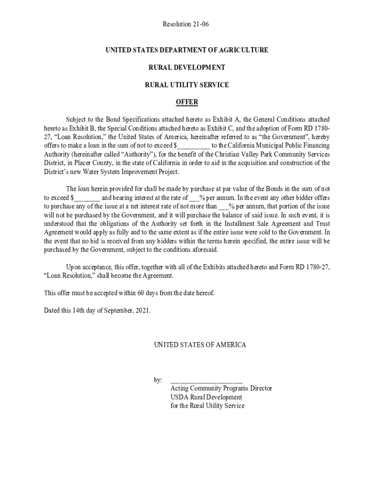 Resolution 2106 UNITED STATES DEPARTMENT OF AGRICULTURE RURAL DEVELOPMENT RURAL UTILITY SERVICE OFFER Subject to the Bond Specifications attached hereto as Exhibit A, the General Conditions attached