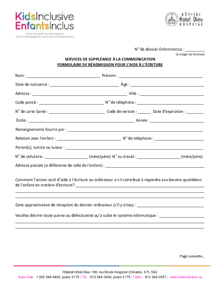 No de dossier EnfantsInclus : ___ (usage Du bureau)SERVICES DE SUPPLANTED LA COMMUNICATION FORMULA IRE DE ADMISSION POUR LAID SCRIPTURE Not : ___ Prom : ___ Date de Renaissance : ___ GE : ___ Address