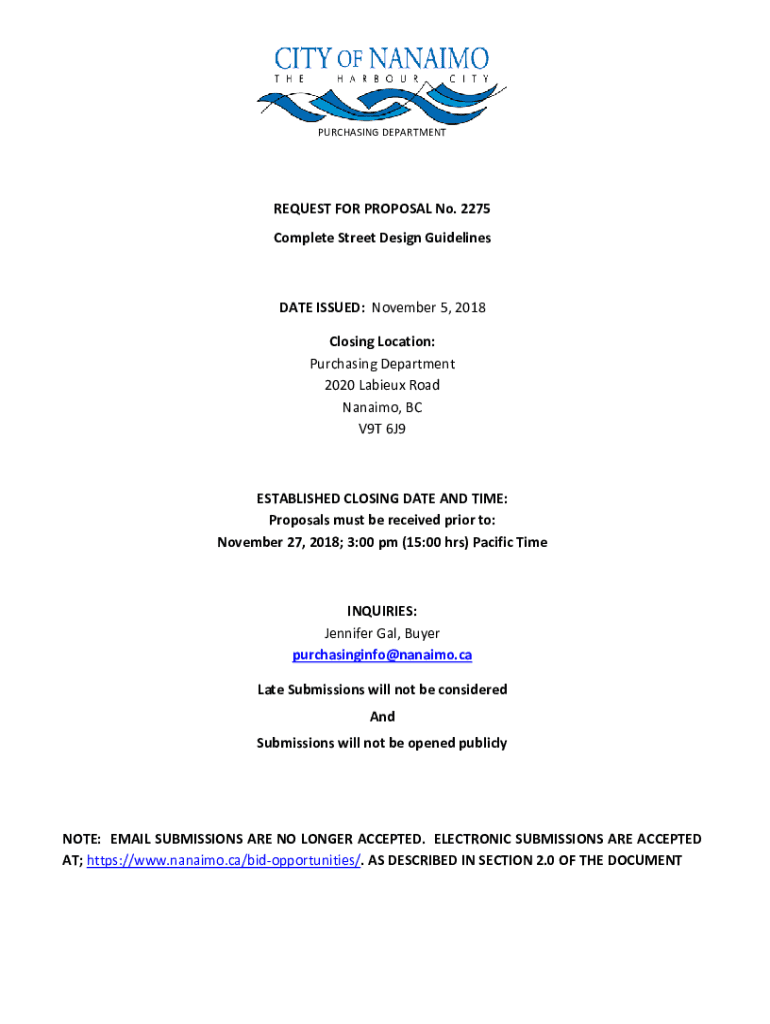 PURCHASING DEPARTMENTREQUEST FOR PROPOSAL No. 2275 Complete Street Design GuidelinesDATE ISSUED: November 5, 2018, Closing Location: Purchasing Department 2020 Lagoon Road Nanaimo, BC V9T 6J9ESTABLISHED