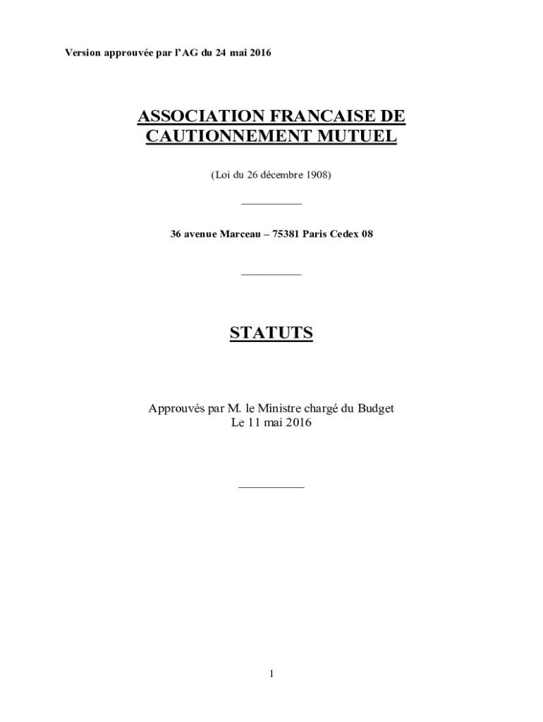 Version approve par lag Du 24 Mai 2016ASSOCIATION FRANCHISE DE CAUTIONNEMENT MUTUAL (LOI Du 26 December 1908) ___ 36 Avenue Marceau 75381 Paris CEDEX 08 ___STATUTSApprouvs par M. LE Minister charge