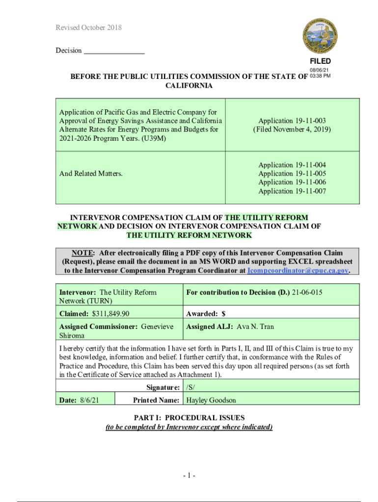 Revised October 2018 Decision FILED 08/06/21BEFORE THE PUBLIC UTILITIES COMMISSION OF THE STATE OF 03:38 PM CALIFORNIA Application of Pacific Gas and Electric Company for Approval of Energy Savings
