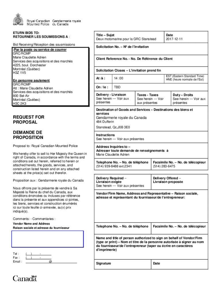 RETURN BIDS TO: RETURNER LES COMMISSIONS A : Bid Receiving/Reception DES sous missions (Par la post of service DE courier GRC/RCMP Marie Claudette Adrien Services DES acquisitions et DES marches 4225,