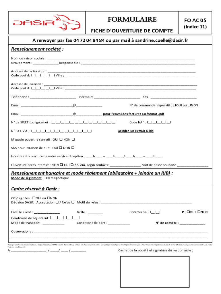 FORMULA IRE FICHE OUVERTURE DE COMPLETE AC 05 (Indie 11)A enjoyed par fax 04 72 04 84 84 of par mail sandrine.cuelle@dasir.fr Enslavement so cit : Not of raisin social : ___ Procurement : ___Responsible