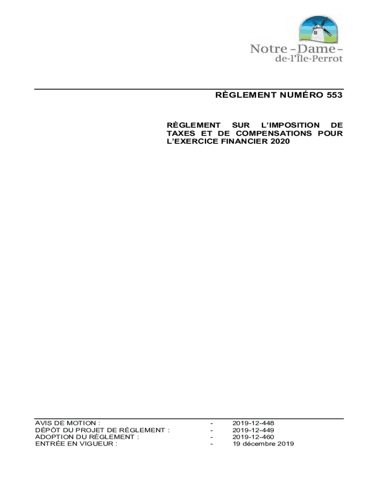 ELEMENT NU MRO 553RGLEMENT SUR IMPOSITION DE TAXES ET DE COMPENSATIONS POUR LEXER CICE FINANCIER 2020AVIS DE MOTION : DPT DU PROJECT DE ELEMENT : ADOPTION DU ELEMENT : ENTIRE EN LIQUEUR :201912448
