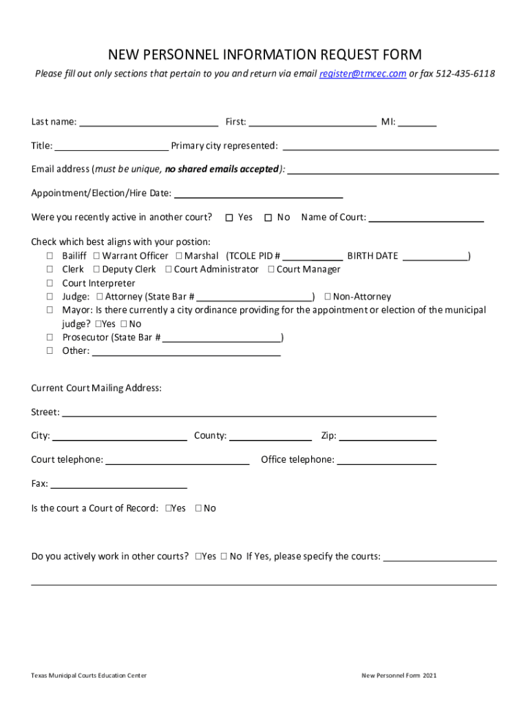 NEW PERSONNEL INFORMATION REQUEST FORM Please fill out only sections that pertain to you and return via email register@tmcec.com or fax 5124356118Last name:First:MI:Title: ___ Primary city represented: