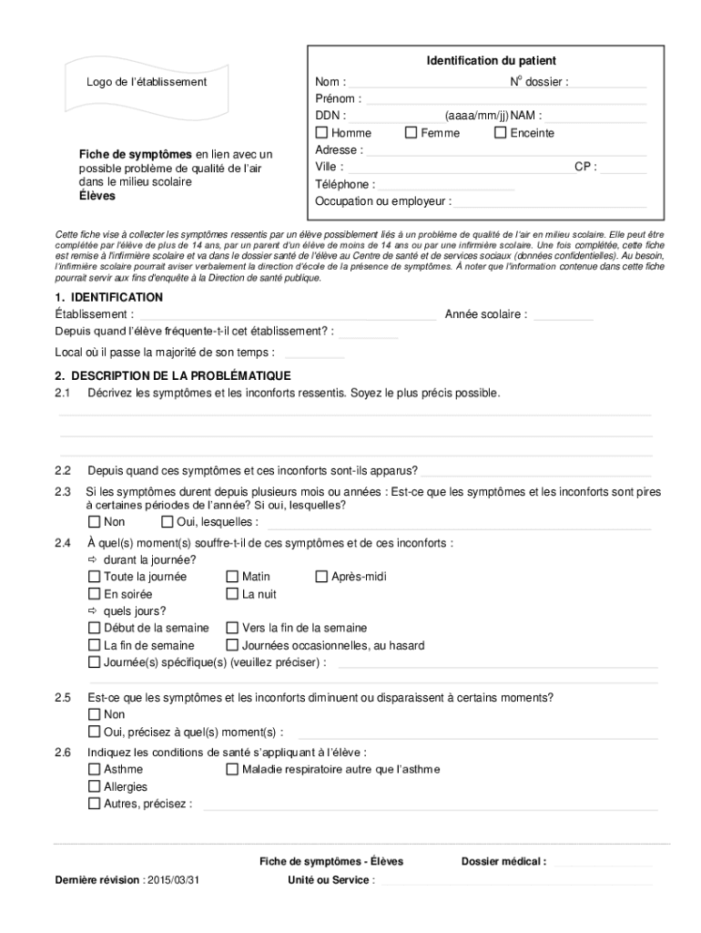 Identification Du patient logo de ltablissementFiche de symptoms en lien Alec UN possible problem DE quality DE lair days LE milieu Claire venom : N dossier : Prom : DAN : (AAAA/mm/JJ) NAM : Home