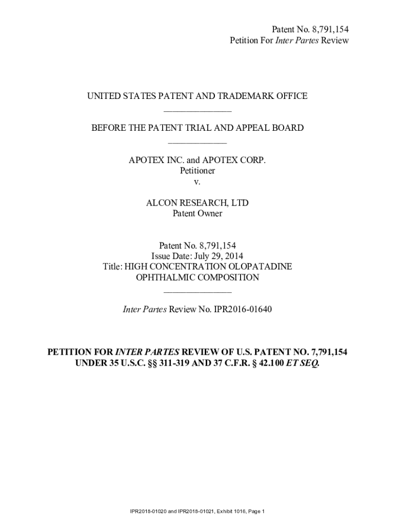 Patent No. 8,791,154 Petition For Inter Parties ReviewUNITED STATES PATENT AND TRADEMARK OFFICE ___ BEFORE THE PATENT TRIAL AND APPEAL BOARD ___ APEX INC. and APEX CORP. Petitioner v. ALTON RESEARCH,