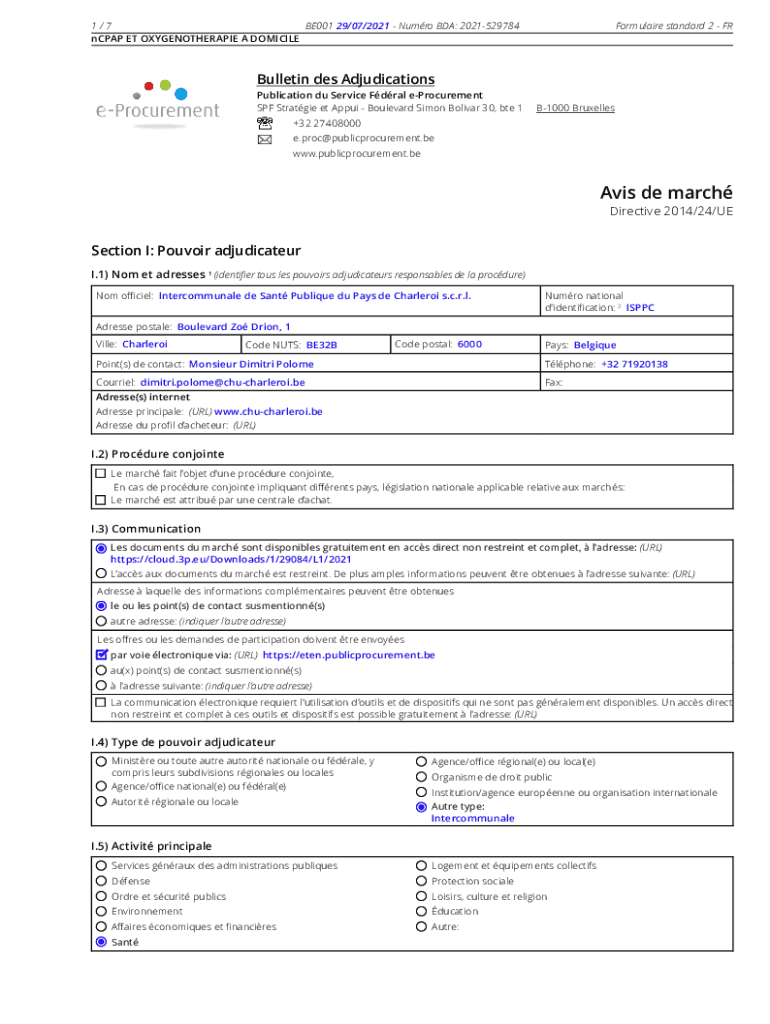 1/7 BE00129/07/2021 Humor BDA: 2021529784 CPAP ET OXYGENOTHERAPIE A DOMICILEFormulaire standard 2 Bulletin DES Adjudications Publication du Service Feral procurement SPF Strategic et Apply Boulevard