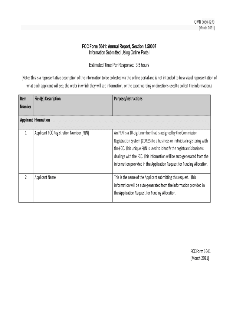 OMB 30601270 [Month 2021]FCC Form 5641: Annual Report, Section 1.50007 Information Submitted Using Online Portal Estimated Time Per Response: 3.5 hours (Note: This is a representative description