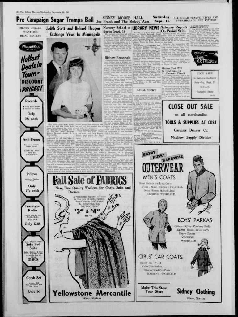 112The Sidney Herald Wednesday, September 12. 1962Pre Campaign SugarSIDNEY MOOSE HALL Joe Frank and The Melody Restamps Bail Judith Scott and Richard Hagen Exchange Vows In MinneapolisSIDNEY HERALD