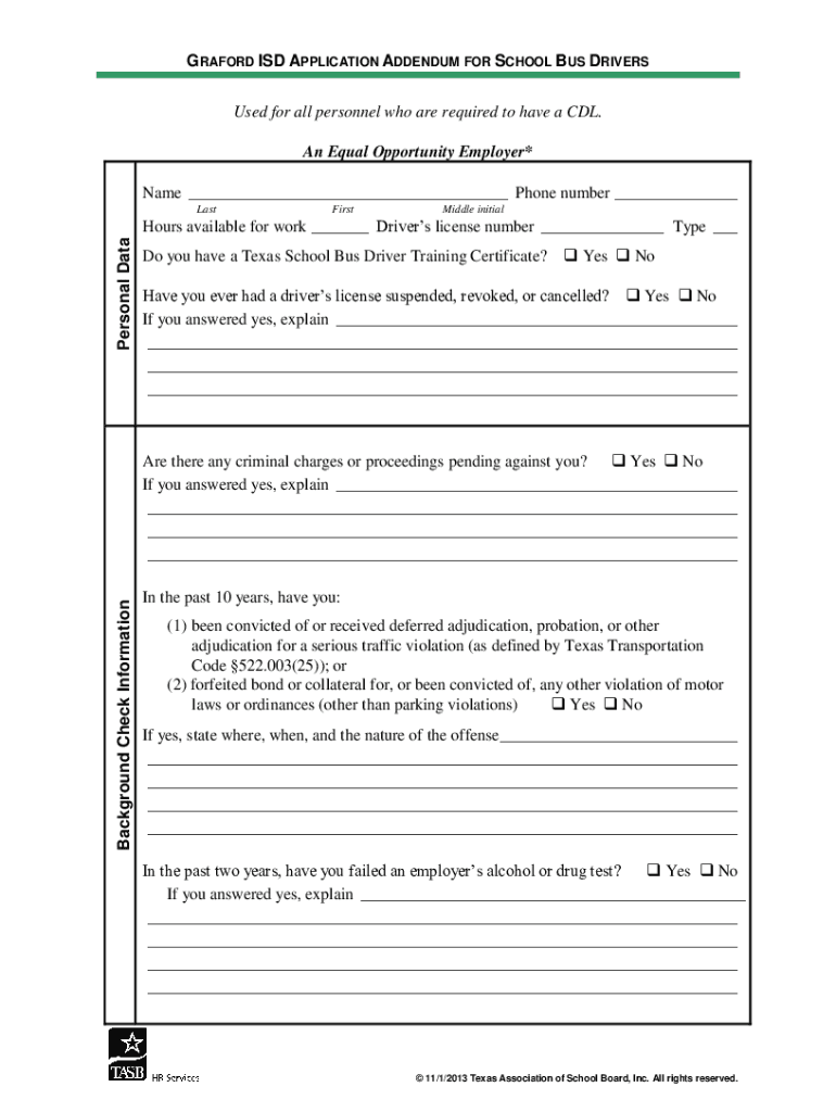 BRADFORD ISD APPLICATION ADDENDUM FOR SCHOOL BUS DRIVERS Used for all personnel who are required to have a CDL. An Equal Opportunity Employer* Name ___ Phone number ___ LastFirstMiddle intrapersonal