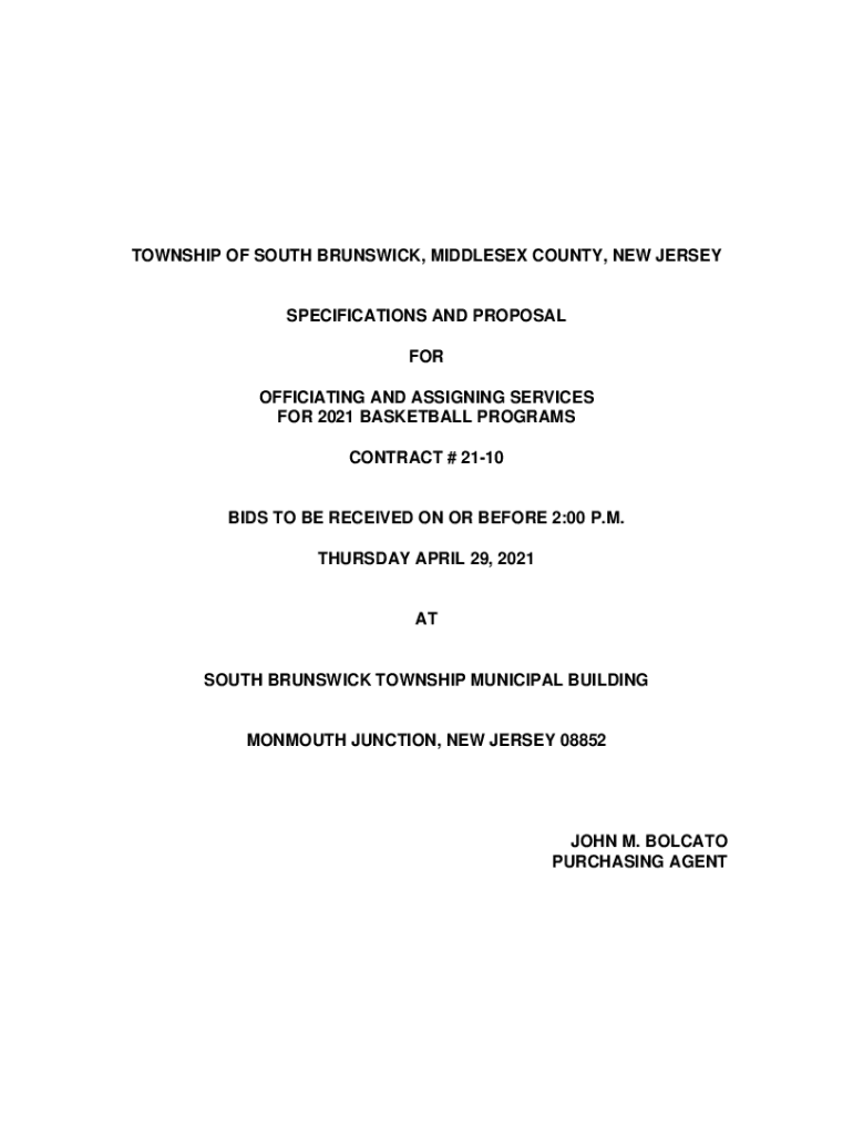 TOWNSHIP OF SOUTH BRUNSWICK, MIDDLESEX COUNTY, NEW JERSEYSPECIFICATIONS AND PROPOSAL FOR OFFICIATING AND ASSIGNING SERVICES FOR 2021 BASKETBALL PROGRAMS CONTRACT # 2110BIDS TO BE RECEIVED ON OR BEFORE