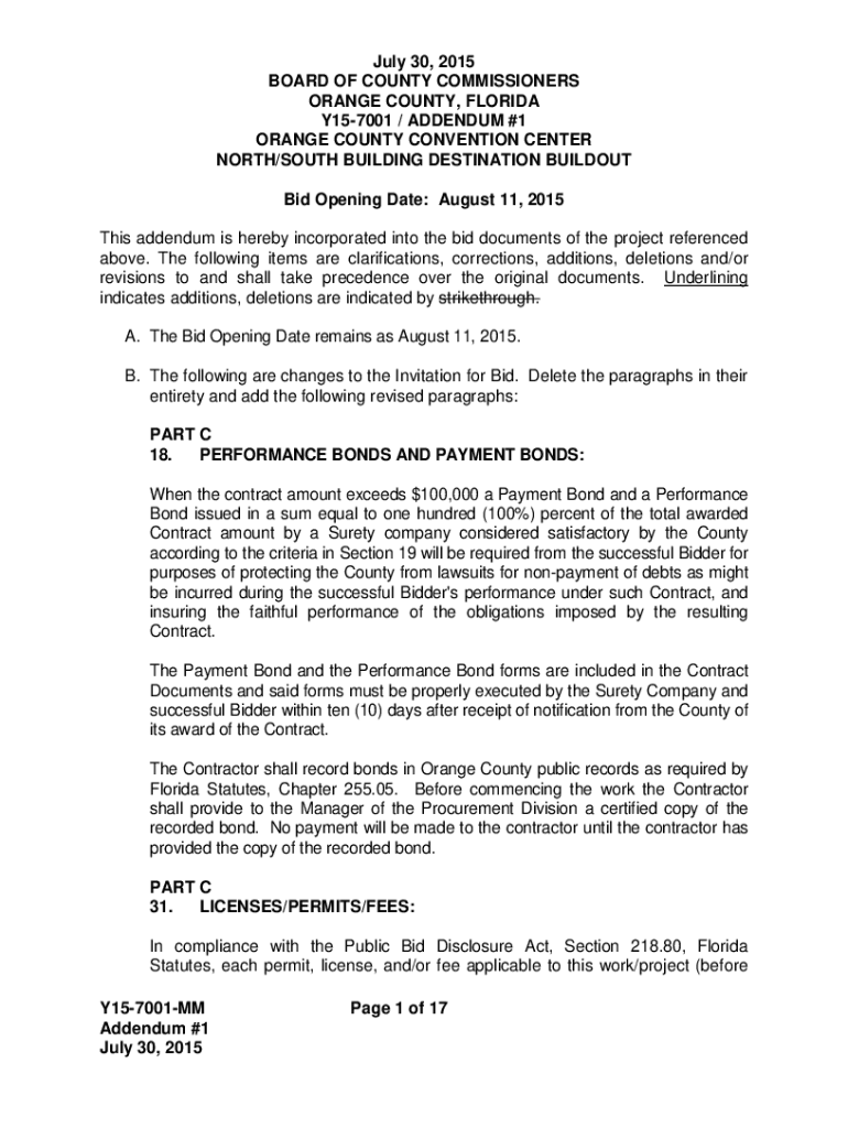 July 30, 2015, BOARD OF COUNTY COMMISSIONERS ORANGE COUNTY, FLORIDA Y157001 / ADDENDUM #1 ORANGE COUNTY CONVENTION CENTER NORTH/SOUTH BUILDING DESTINATION BUILDUP Bid Opening Date: August 11, 2015,