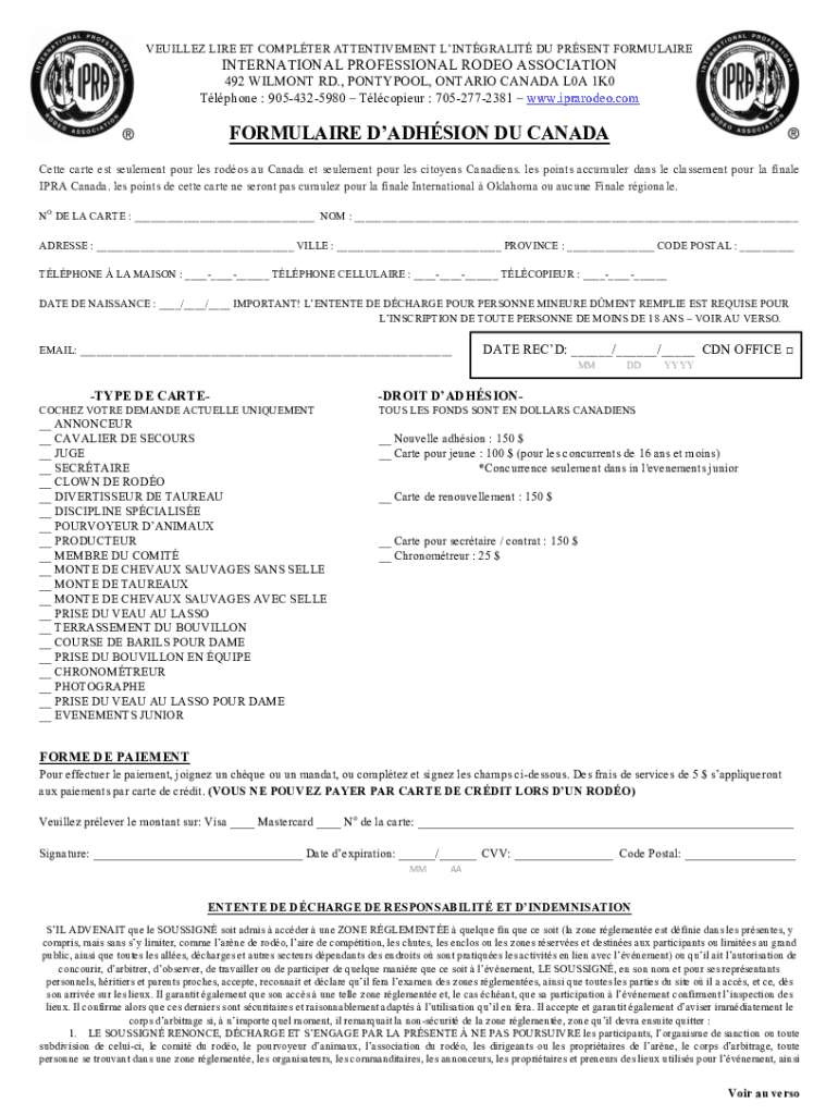 VEHICLE LIRE ET COMPUTER ATTENTIVENESS INTEGRALITY DU PRESENT FORMULAIREINTERNATIONAL PROFESSIONAL RODEO ASSOCIATION 492 WILMOT RD., PONTOON, ONTARIO CANADA L0A 1K0 Tl phone : 9054325980 Copiers :