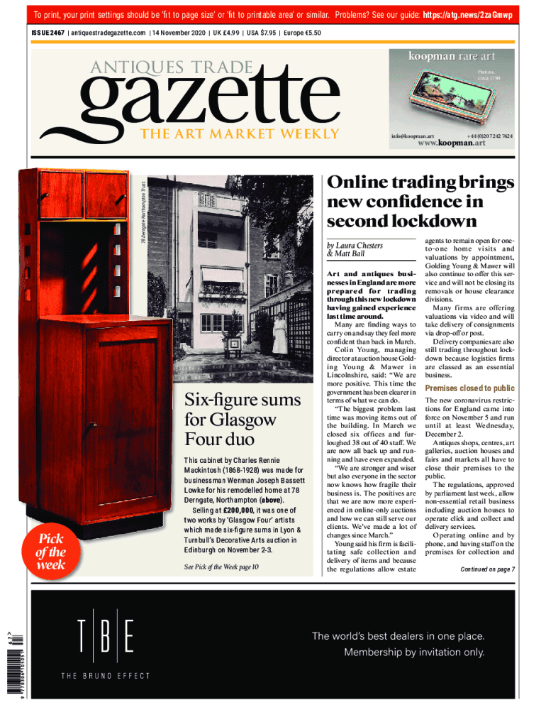 To print, your print settings should be fit to page size or fit to printable area or similar. Problems? See our guide: HTTPS://ATG.news/2zaGmwp ISSUE 2467 | antiquestradegazette.com | 14 November