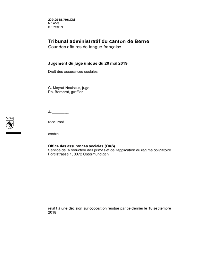 200.2018.706.CM N AVS BEP/Tribunal administration Du canton DE Borne Four DES affairs DE large franaiseJugement Du June unique Du 20 Mai 2019 Droid DES assurances socialist. Marat Bauhaus, June pH.