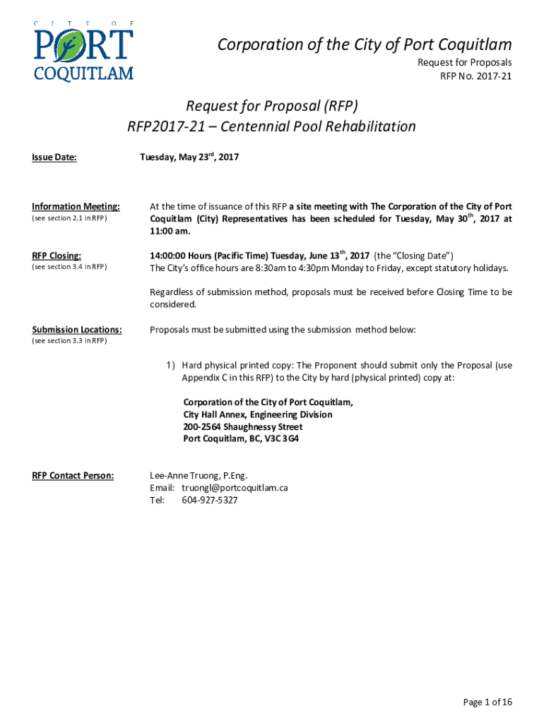Corporation of the City of Port Coquitlam Request for Proposals RFP No. 201721Request for Proposal (RFP) RFP201721 Centennial Pool Rehabilitation Issue Date:Information Meeting: (see section 2.1 in