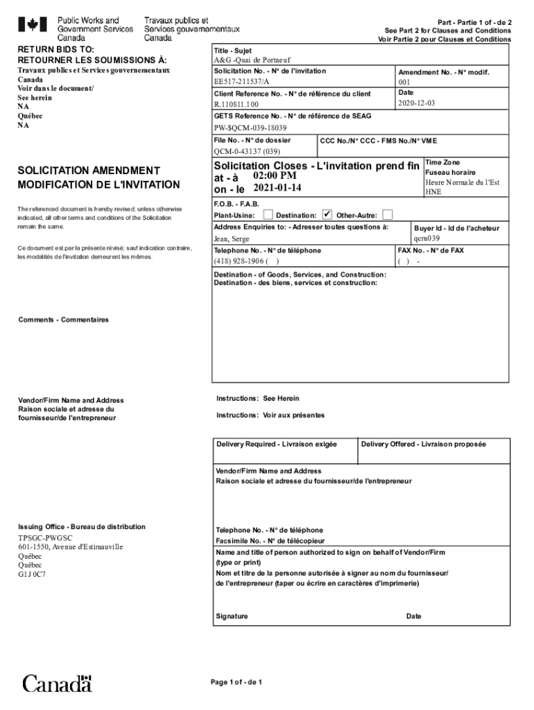 RETURN BIDS TO: RETURNER LES COMMISSIONS : Travail public set Services gouvernementaux Canada Void days LE document/ See herein NA Quebec Apart Parties 1 of DE 2 See Part 2 for Clauses and Conditions