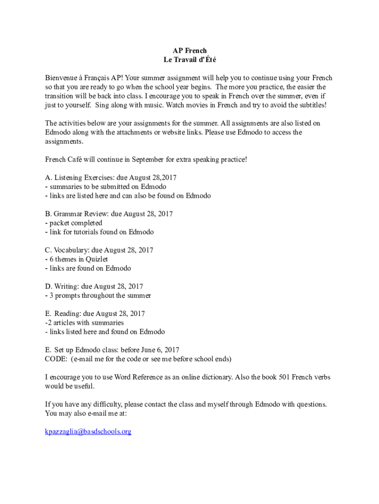 Get the free AP French Le Travail d't BienvenueFranais AP! Your summer ... - basdwpweb beth k12 pa