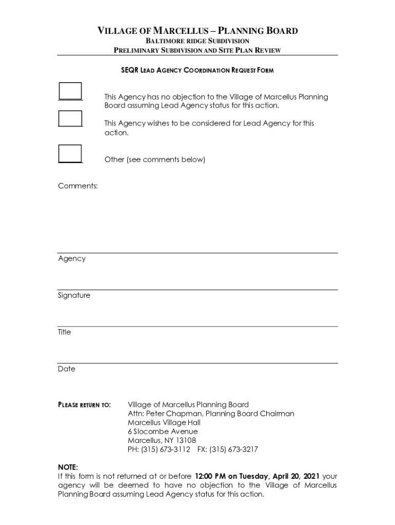 VILLAGE OF MARCELLUS PLANNING BOARD 6 WYCOMBE AVENUE MARCELLUS, NY 13108BALTIMORE RIDGE SUBDIVISION STATE ENVIRONMENTAL QUALITY REVIEW (SEER) LEAD AGENCY COORDINATION PACKAGEMARCH 2021Prepared byte