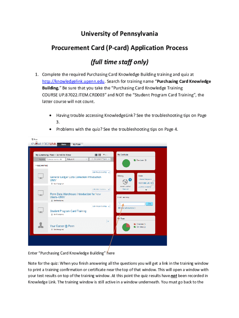 University of Pennsylvania Procurement Card (Card) Application Process (full time staff only) 1. Complete the required Purchasing Card Knowledge Building training and quiz at HTTP://knowledge link.Penn.edu.