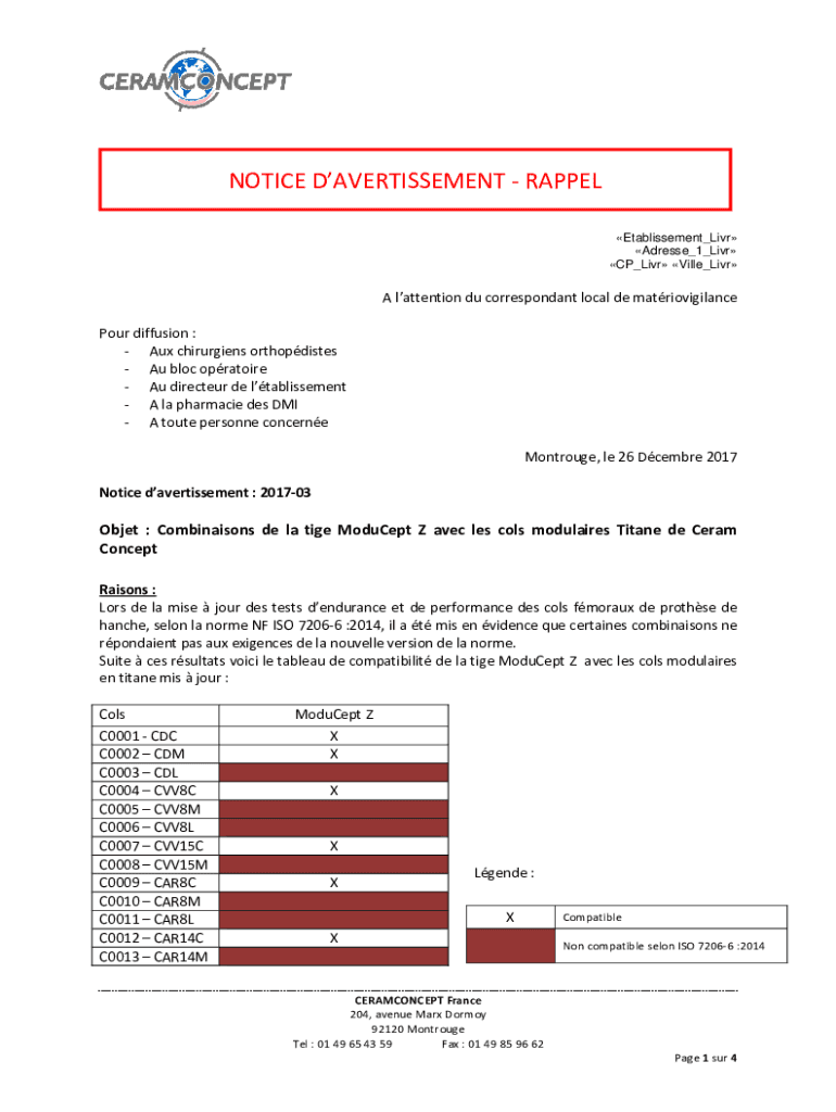 NOTICE ADVERTISEMENT RAPPEL Etablissement_Livr Address_1_Live CP_Livr Ville_LivrA attention Du correspondent local de matriovigilance Pour diffusion : Aux chirurgiens orthopedists Au bloc operator