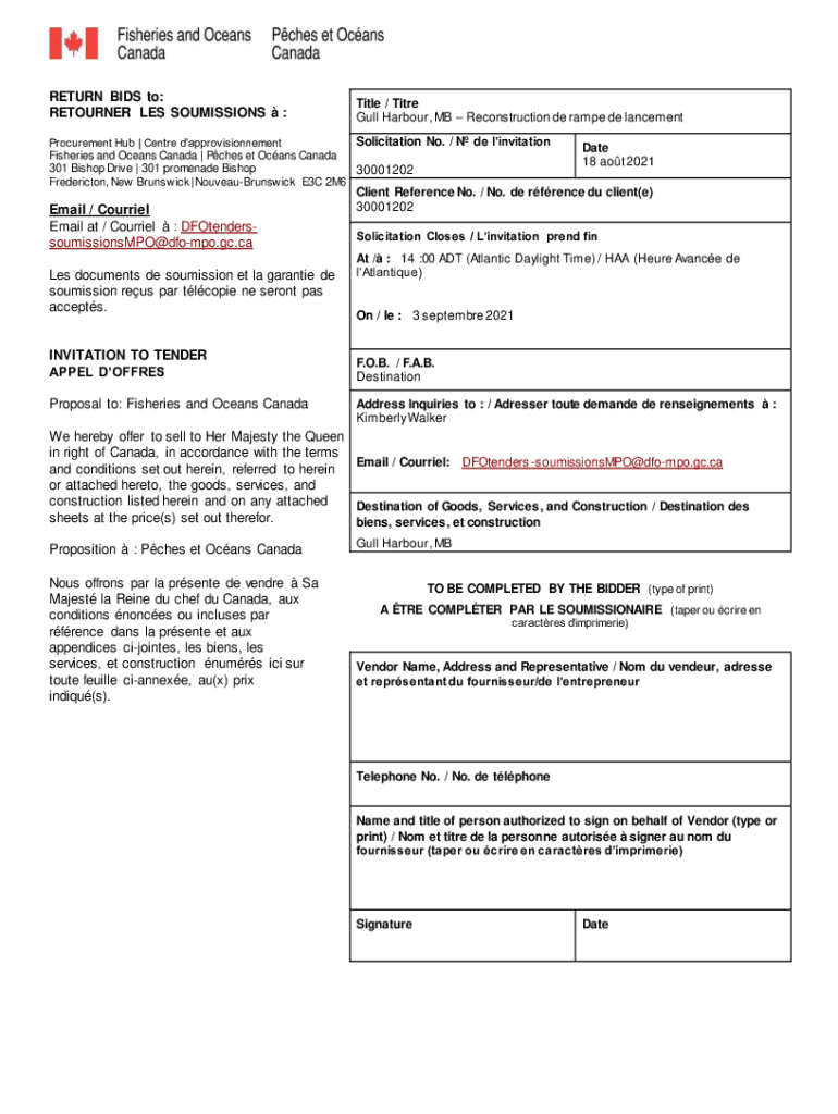 RETURN BIDS to: RETURNER LES COMMISSIONS :Title / Title Gull Harbor, MB Reconstruction de ramp de lancementSolicitation No. / N de invitation Procurement Hub | Center dapprovisionnement Fisheries