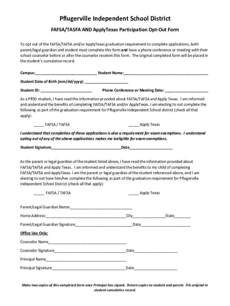 Pflugerville Independent School District FAFSA/TASHA AND Apply Texas Participation Opt-out Form Beginning with the 20192020 school year (and beyond), each graduating from high school senior in Pflugerville