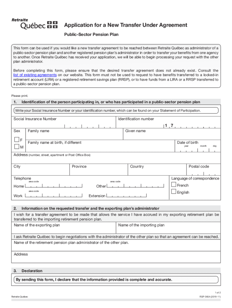 Application for a New Transfer Under Agreement PublicSector Pension Plan This form can be used if you would like a new transfer agreement to be reached between Retrieve Quebec as administrator of
