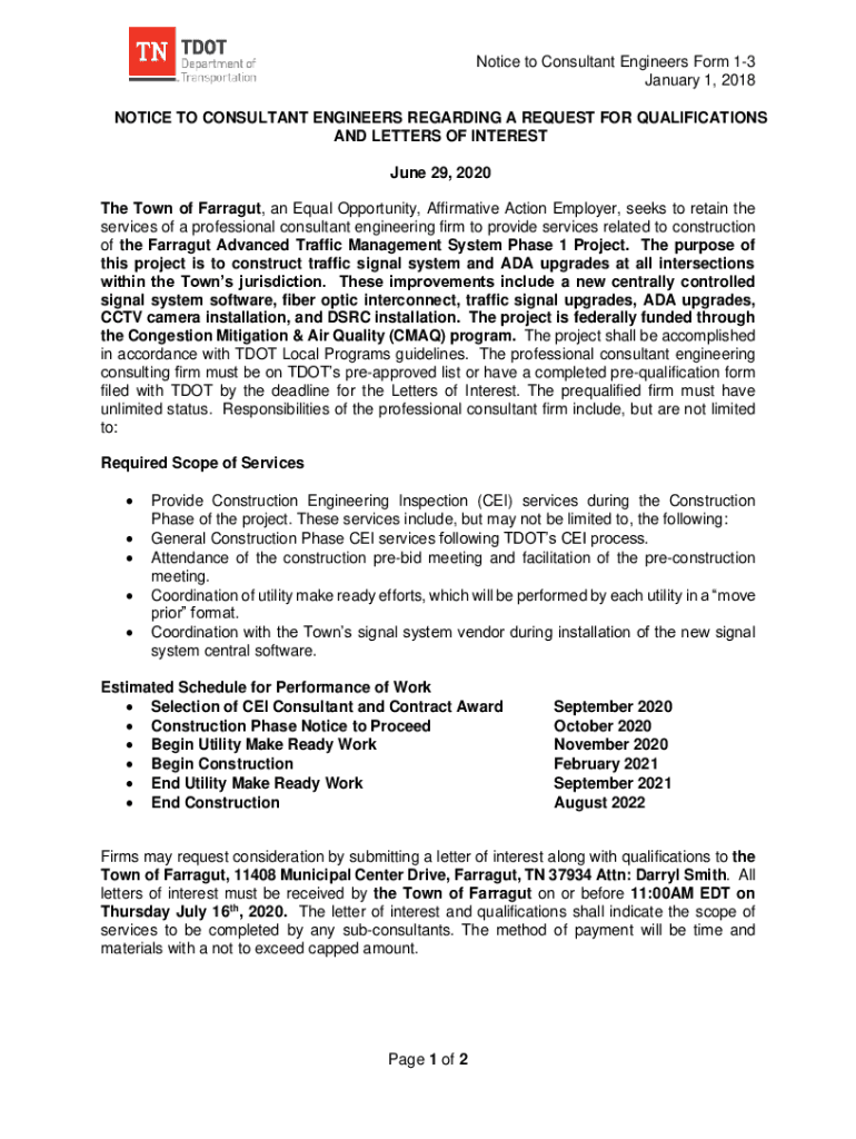 Notice to Consultant Engineers Form 13 January 1, 2018, NOTICE TO CONSULTANT ENGINEERS REGARDING A REQUEST FOR QUALIFICATIONS AND LETTERS OF INTEREST June 29, 2020, The Town of Farragut, an Equal