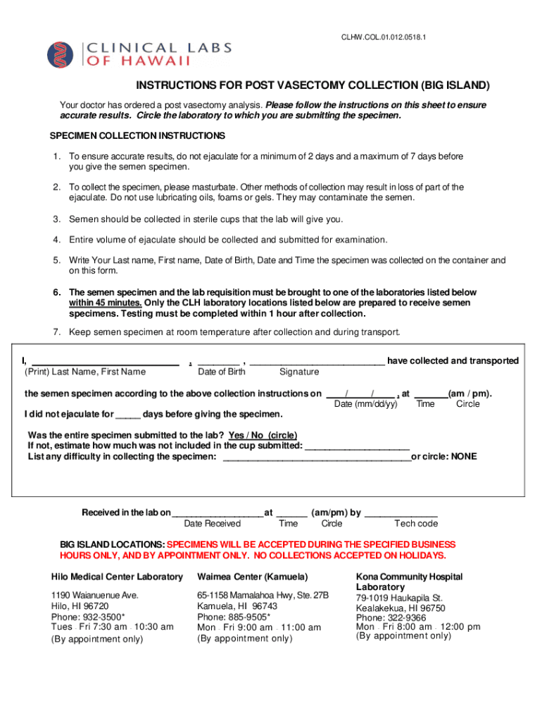 CLAW.COL.01.012.0518.1INSTRUCTIONS FOR POST VASECTOMY COLLECTION (BIG ISLAND) Your doctor has ordered a post vasectomy analysis. Please follow the instructions on this sheet to ensure accurate results.