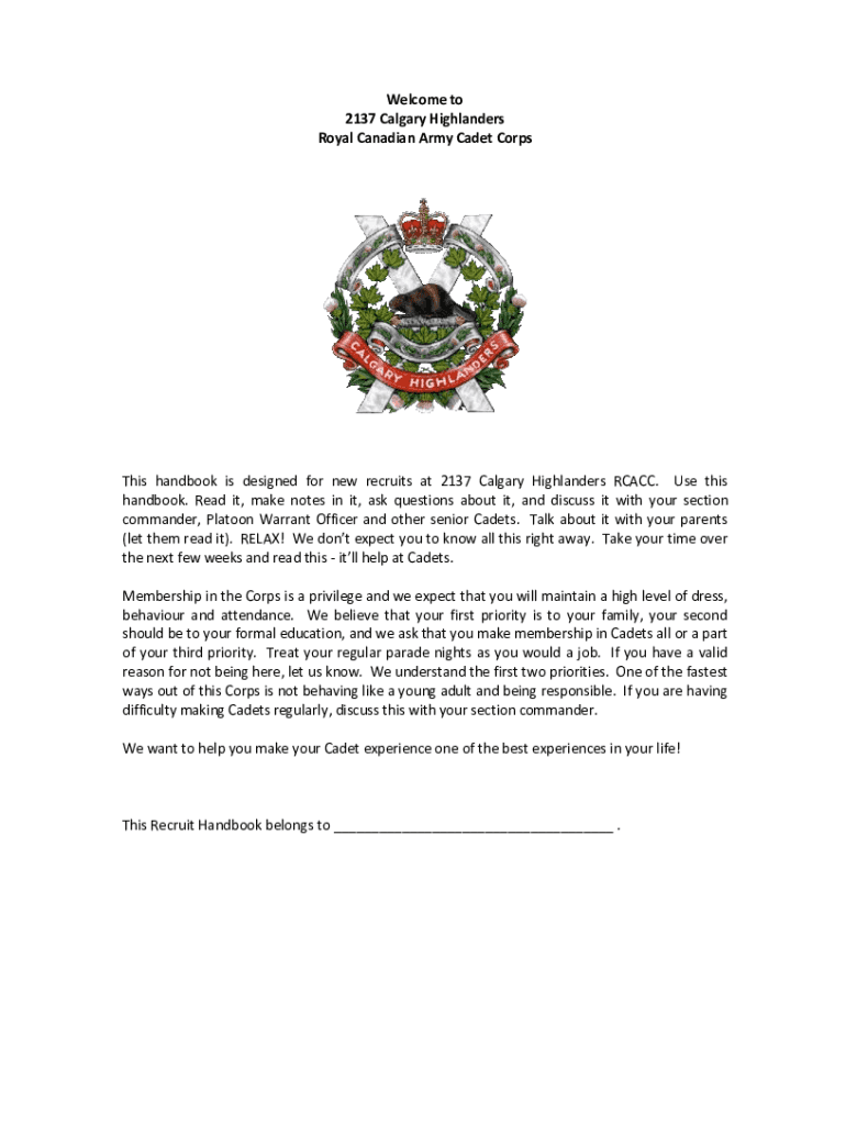 Welcome to 2137 Calgary Highlanders Royal Canadian Army Cadet Corpses handbook is designed for new recruits at 2137 Calgary Highlanders RC ACC. Use this handbook. Read it, make notes in it, ask questions