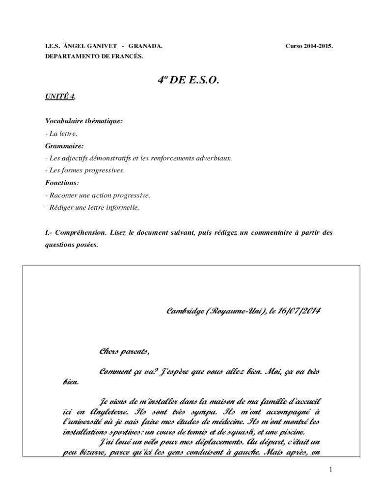 I.E.S. ANGEL GANNET GRANADA. Curse 20142015.DEPARTMENT DE FRANCS.4 DE E.S.O. UNIT 4. Vocabulary thematize: La letter. Grammar: Les adjective demonstration ET LES reinforcements adverbial. Les forms