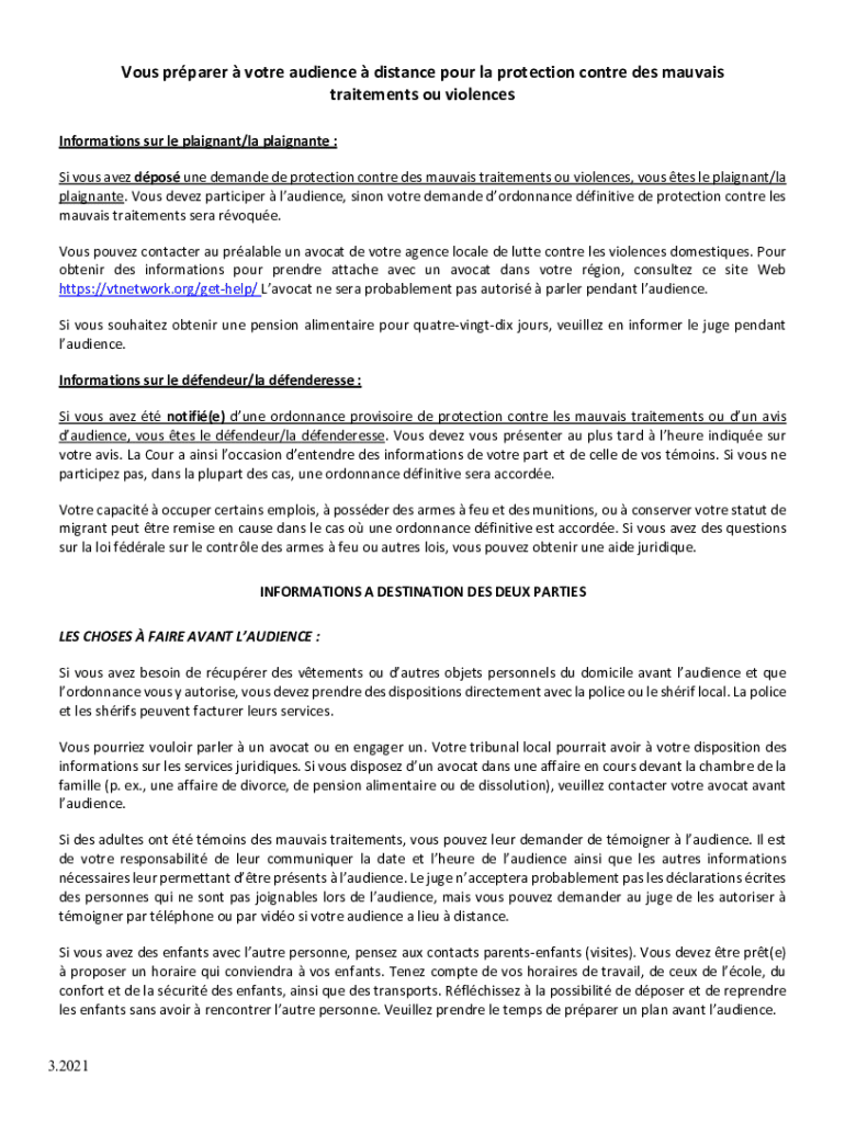 Vous prparer votre audience distance pour la protection contre des mauvais traitements ou violences Informations sur le plaignant/la plaignante : Si vous avez dpos une demande de protection contre