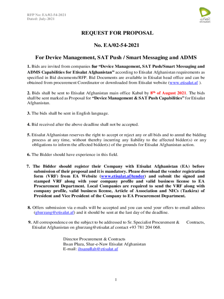 RFP No: EA/02542021 Dated: July2021REQUEST FOR PROPOSAL No. EA/02542021 For Device Management, SAT Push / Smart Messaging and ARMS 1. Bids are invited from companies for Device Management, SAT Push/Smart