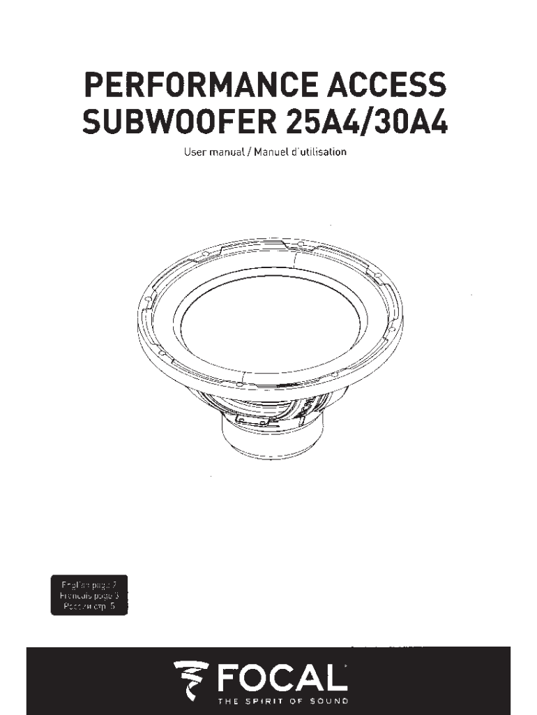 PERFORMANCE ACCESS SUBWOOFER 25A4/30A4 User manual I Manuel d\'utilisationEngl1sh PUC 2 PGC 3 Poccvn1 e1p 5Frana1sPERFORMANCE ACCESS SUBWOOFERS 25A4/30A4 User manualfJThank you for choosing Focal