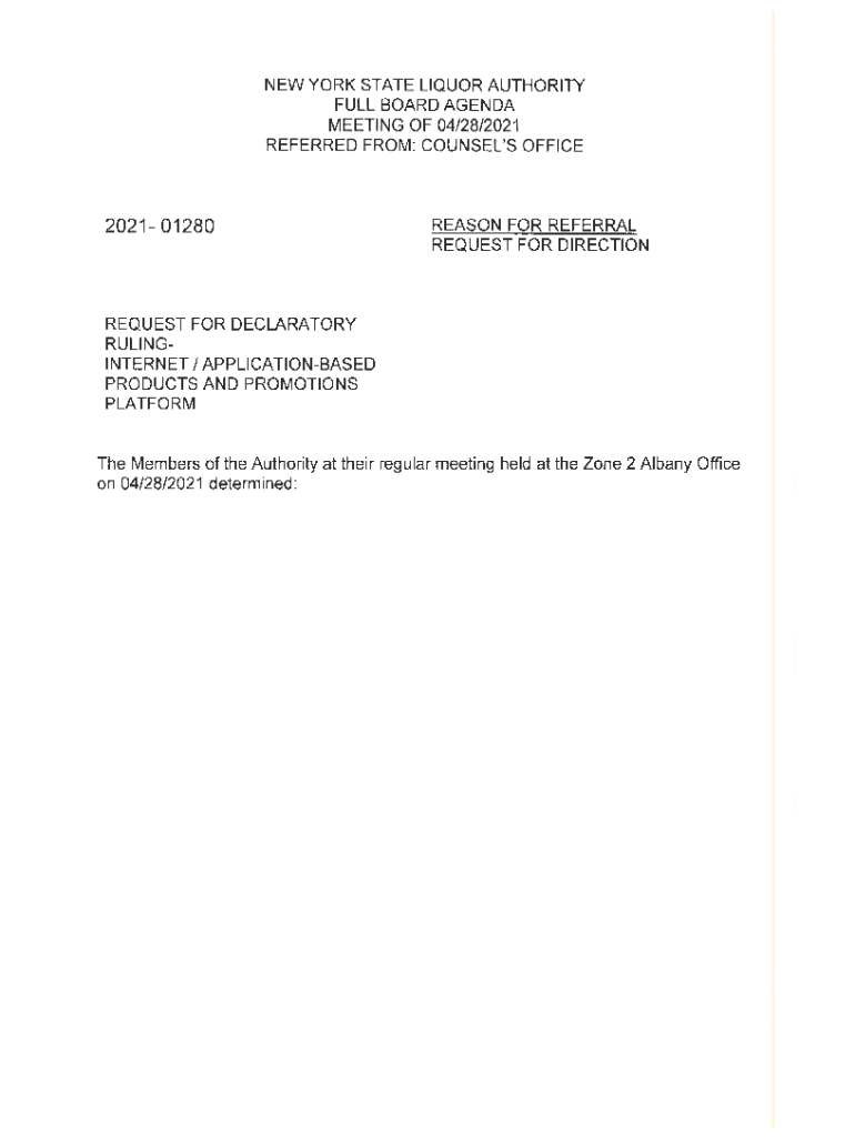 NEW YORK STATE LIQUOR AUTHORITY FULL BOARD AGENDA MEETING OF 04/28/2021 REFERRED FROM : COUNSEL\'S OFFICE202101280REASON FOR REFERRAL REQUEST FOR DIRECTIONREQUEST FOR DE DECLARATORY RULINGINTERNET