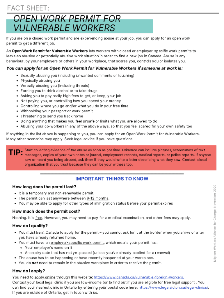 FACT SHEET:OPEN WORK PERMIT FOR VULNERABLE WORKERS If you are on a closed work permit and are experiencing abuse at your job, you can apply for an open work permit to get a different job. An Open