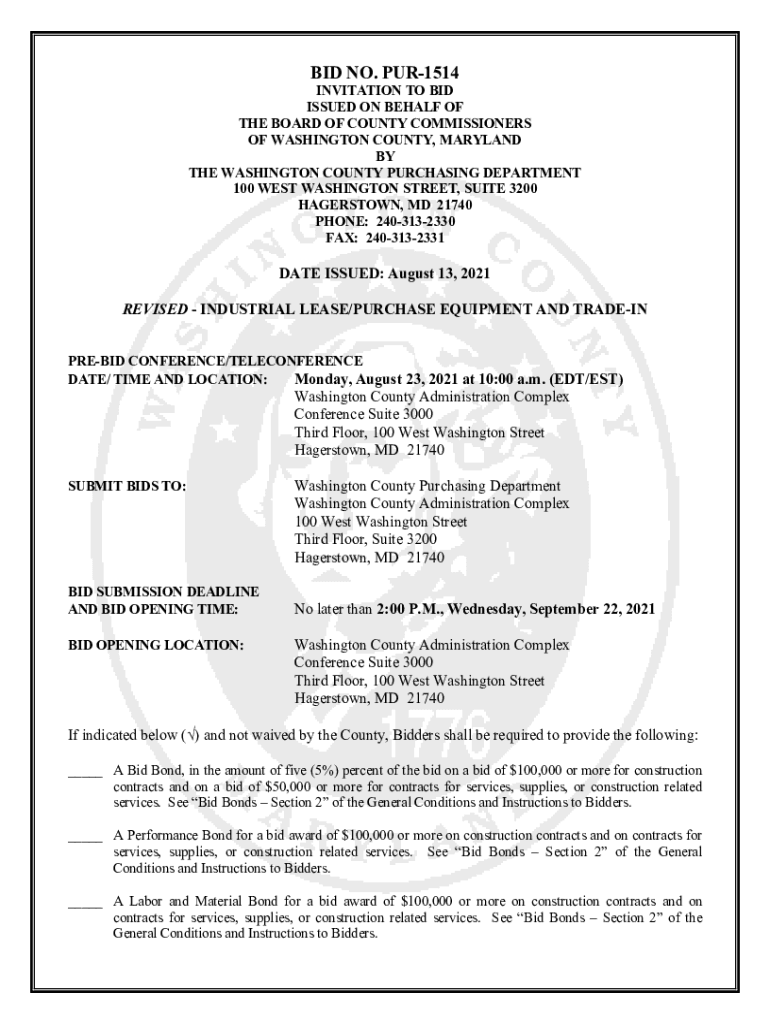 BID NO. PUR1514INVITATION TO BID ISSUED ON BEHALF OF THE BOARD OF COUNTY COMMISSIONERS OF WASHINGTON COUNTY, MARYLAND BY THE WASHINGTON COUNTY PURCHASING DEPARTMENT 100 WEST WASHINGTON STREET, SUITE