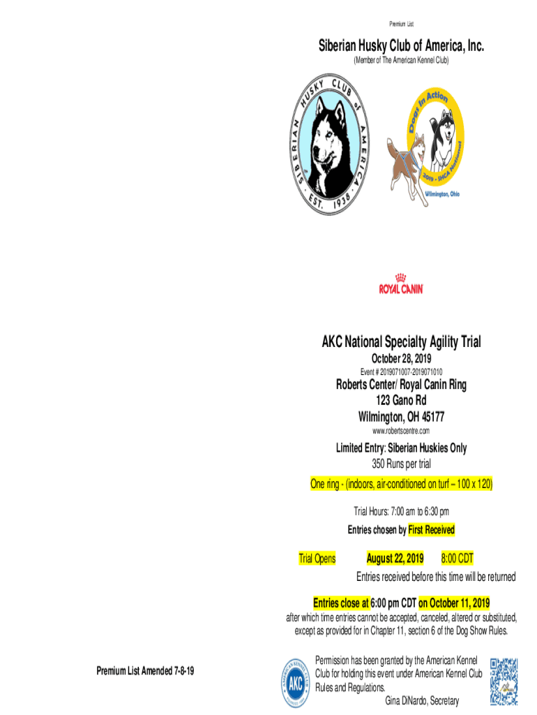 Premium List Siberian Husky Club of America, Inc. (Member of The American Kennel Club)AKC National Specialty Agility Trial October 28, 2019, Event # 20190710072019071010Roberts Center/ Royal Canin