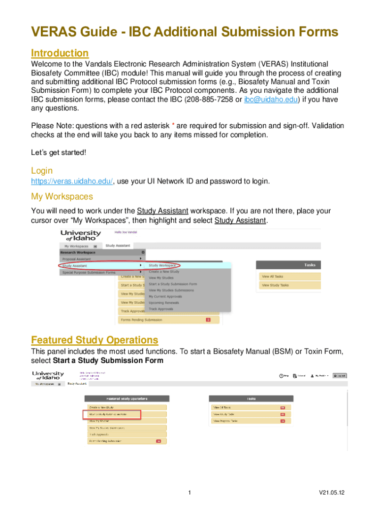 VEGAS Guide IBC Additional Submission Forms Introduction Welcome to the Vandals Electronic Research Administration System (VEGAS) Institutional Biosafety Committee (IBC) module! This manual will guide