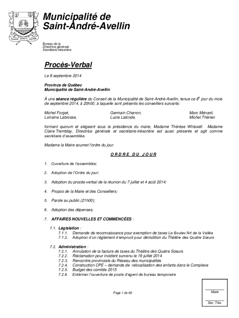 Municipality de SaintAndrAvellin Bureau DE la Direct rice GRALE SecrtairetrsorireProcsVerbal Le 8 September 2014 Province de Qubec Municipality de SaintAndrAvellin e one since regular Du Conrail de