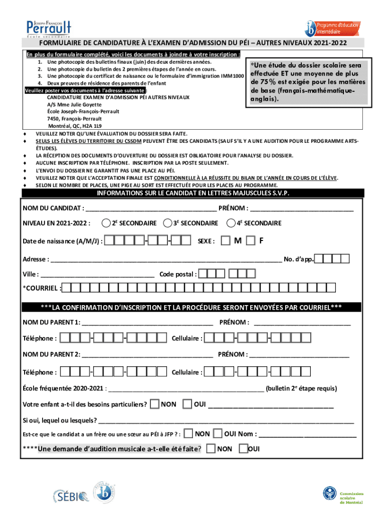 FORMULA IRE DE CANDIDATURE EXAMEN ADMISSION DU PI AUT RES NIVEA 20212022 En plus Du formula ire comply, voice LES documents joiner vote inscription : 1. One photocopied DES bulletins fin aux (join)