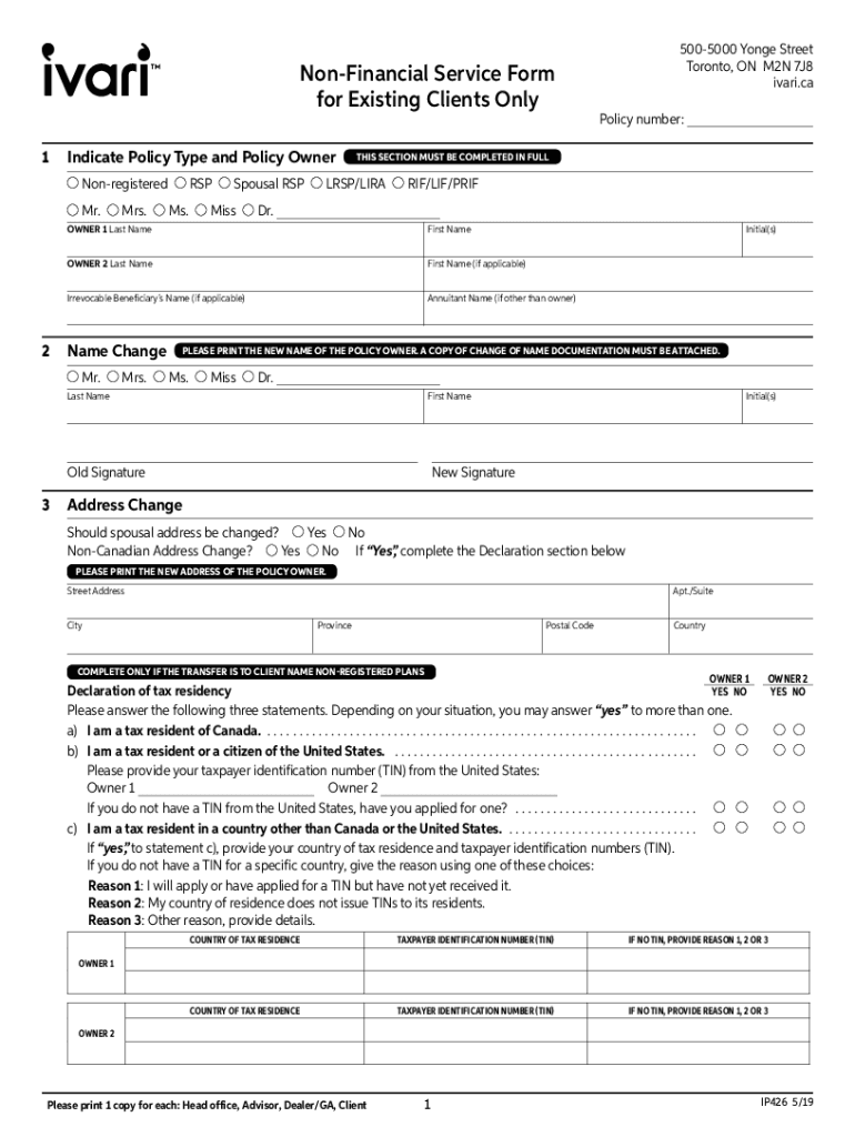 Financial Service Form for Existing Clients Only 1Indicate Policy Type and Policy Owner Nonregistered Mr. Mrs.RS PMs. Spousal RSPMissLRSP/LIRA RIF/IF/Prior. First Homeowner 2 Last NameFirst Name (if