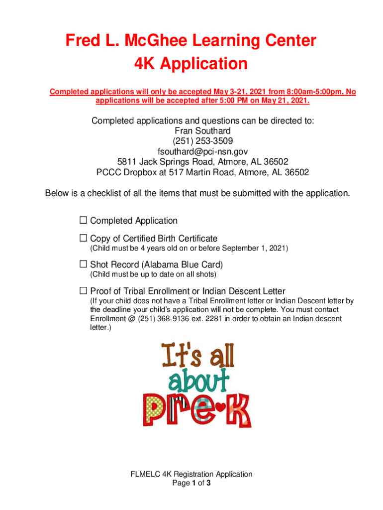 Fred L. McGhee Learning Center 4K Application Completed applications will only be accepted May 321, 2021 from 8:00am5:00pm. No applications will be accepted after 5:00 PM on May 21, 2022. Completed