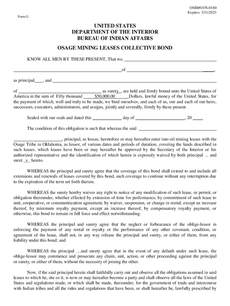 OMB#10760180 Expires: 3/31/2023 Form UNITED STATES DEPARTMENT OF THE INTERIOR BUREAU OF INDIAN AFFAIRS OSAGE MINING LEASES COLLECTIVE BOND KNOW ALL MEN BY THESE PRESENT, That we, of as principal___,