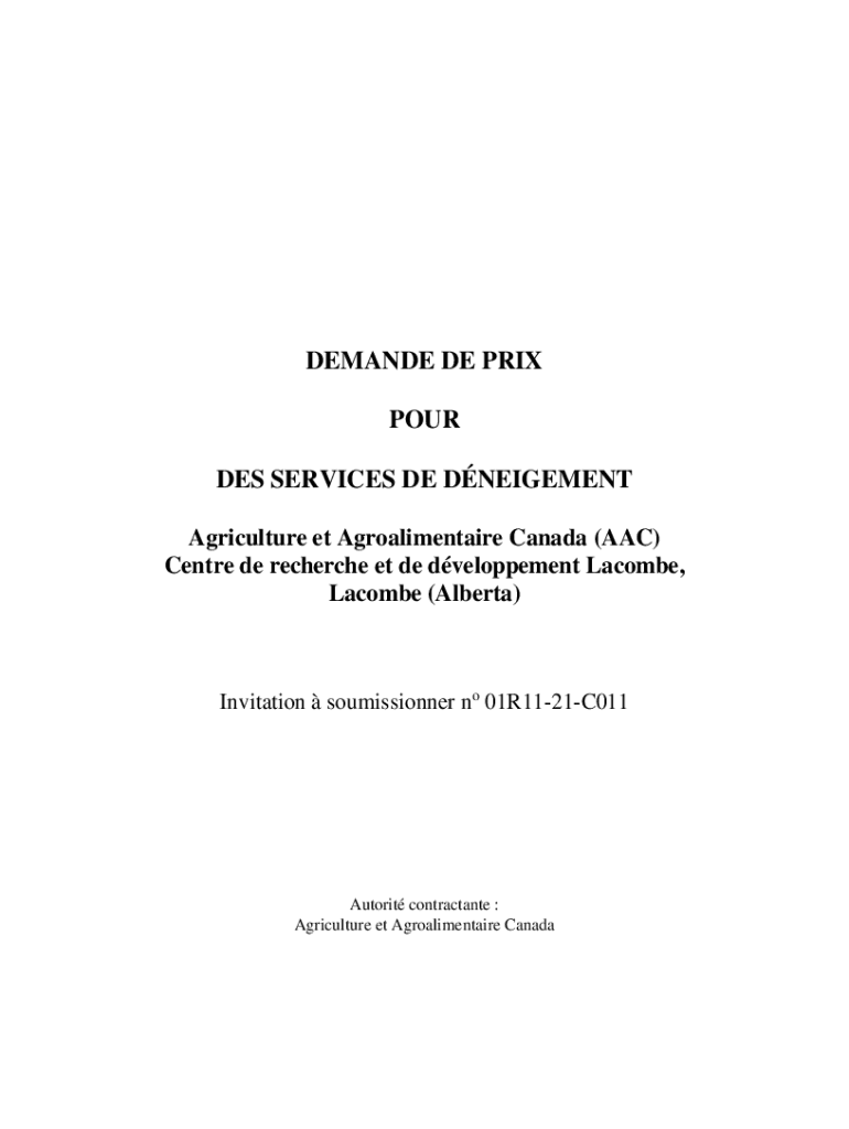 DEMAND DE PRI POUR DES SERVICES DE ENGAGEMENT Agriculture et Agroalimentaire Canada (AAC) Center de recherché et de development Wycombe, Wycombe (Alberta)Invitation commissioner no 01R1121C011Autorit