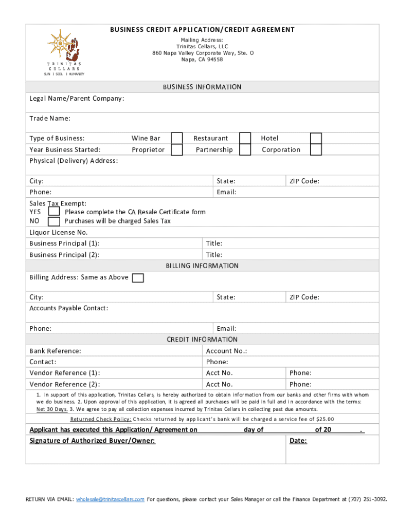 BUSINESS CREDIT APPLICATION /CREDIT AGREEMENT R I N I T A S C E L L A RS Mailing Address: Trinity Cellars, LLC 860 Napa Valley Corporate Way, Ste. O Napa, CA 94558SUN I SOIL I HUMANITYBUSINESS INFORMATION