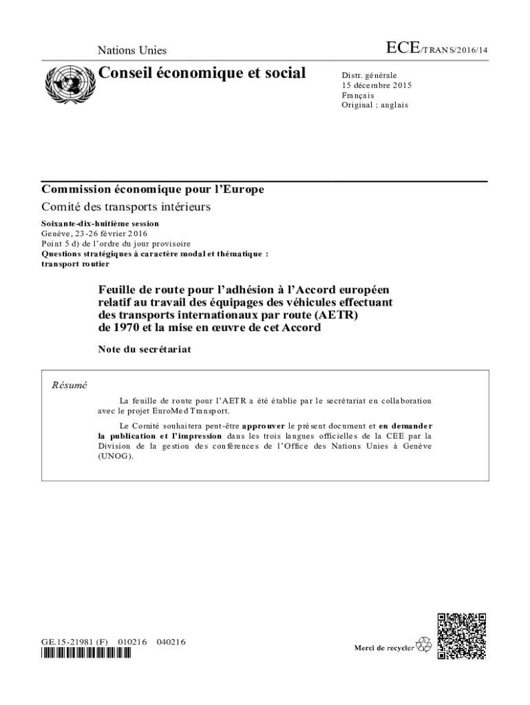 Nations UniesConseil continue ET social ECE/TRANS/2016/14 Dist. GRALE 15 December 2015 Francis Original : anglaisCommission continue pour Europe Comic DES transports intrigues Soixantedixhuitime session